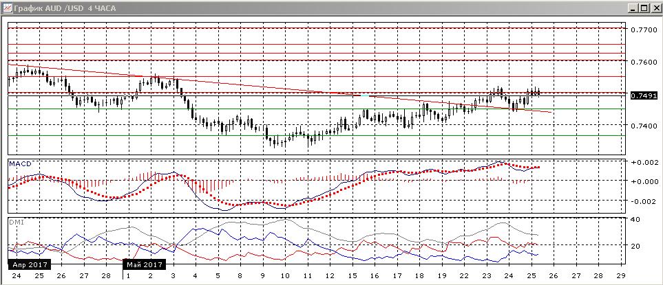 На дневном графике пара после отката получила поддержку на ранее преодолённом уровне сопротивления на 0,7450, и после образования «падающей звезды» ниже 0,7500 отката не произошло. Пара вернулась к уровню 0,7500, и дальнейшая перспектива как и ране зависит от преодоления этого важного уровня сопротивления. Также пара остаётся выше линии нисходящего тренда, если строить её с середины марта. Это сочетание предполагает возможность разворота пары к росту. По индикаторам направленного движения это приближается — гистограмма MACD растёт в положительной зоне, линия MACD получила положительный наклон.