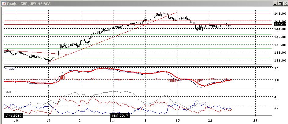 На дневном графике пара остаётся в диапазоне 144,00-145,00, консолидация остаётся в диапазоне свечи 17 мая. Дальнейшее движение, скорее будет в направлении выхода из этой консолидации, предпочтительно возобновление снижения (в направлении предшествующей тенденции) к поддержке на 142,50. По индикаторам направленного движения сохраняется коррекция к росту: превышение DM+ над DM- сохраняется, хотя оно и небольшое. Гистограмма MACD остаётся в отрицательной области, линия MACD сохраняет отрицательный наклон.