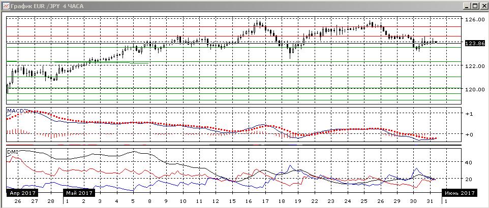 На четырёхчасовом графике видно, что текущий отскок от 123,50 был ограничен уровнем сопротивления 124,50, и снижение скорее возобновится, так как отскок, кажется, коррекционный. Последовательность снижения относительных максимумов и минимумов пары от 125,30 не нарушена. По индикаторам направленного движения выраженной тенденции нет (это соответствует движению в диапазоне между 123,50 и 125,30). Исходя из размера канала, целью снижения может быть уровень около 121,00.
