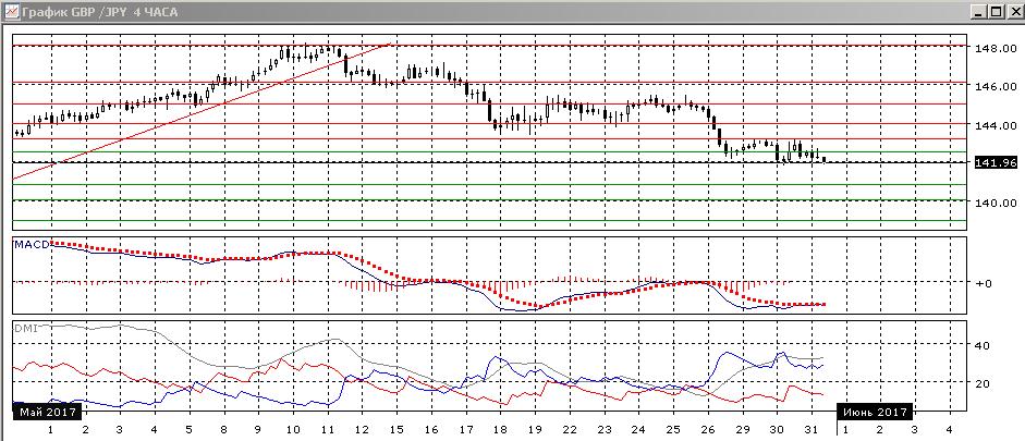 На четырёхчасовом графике снижение продолжается, пара достигла более низкого минимума, 30 мая, последовательность снижения относительных максимумов и минимумов пары от 145,00 сохраняется. Видно замедление тенденции — новые минимумы не подтверждаются по гистграмме MACD, но в целом тенденция очень сильная, что видно по ADX: превышение DM- над DM+ остаётся большим и устойчивым, ADX на высоком уровне. Если не образуется база около 142,00 (около этого уровня три минимума), то снижение после текущей консолидации выше 142,00 и ниже 143,20, скорее, ускорится.