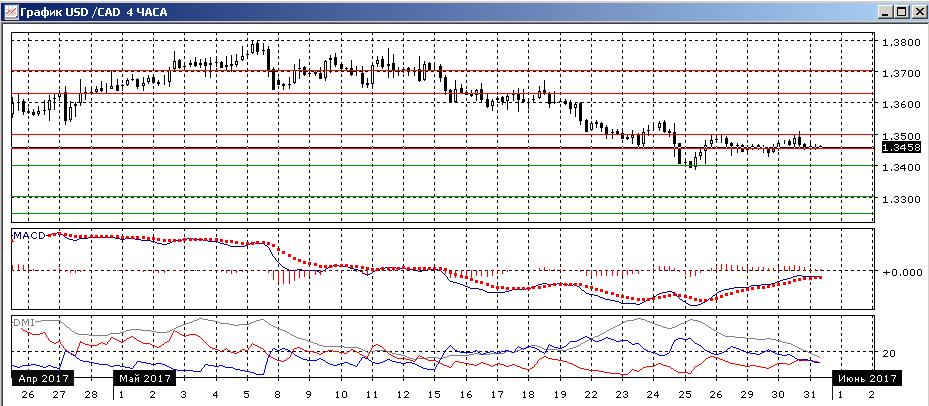 На четырёхчасовом графике коррекционное движение от 1,3400 сохраняется. На 1,3500, возможно, образовалась двойная вершина и это увеличивает шансы на возвращение пары в уровню начала коррекционного движения на 1,3400. По индикаторам направленного движения ситуация нейтральная.
