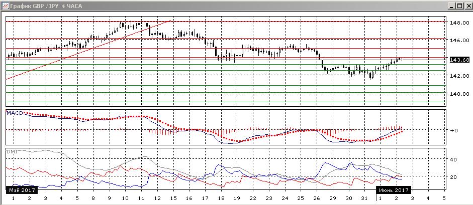 На дневном графике происходит отскок вверх от 142,00, ранее около этого уровня образовалась разворотная свечная комбинация с «молотом». С другой стороны, текущий отскок остаётся в рамках коррекции, его размер не превышает предыдущего (с 18 по 25 мая). Последовательность снижения относительных максимумов и минимумов пары от 148,00 не нарушена. По индикаторам направленного движения снижение остаётся тенденцией: DM- выше DM-, гистограмма MACD остаётся в отрицательной области, линия MACD сохраняет отрицательный наклон.