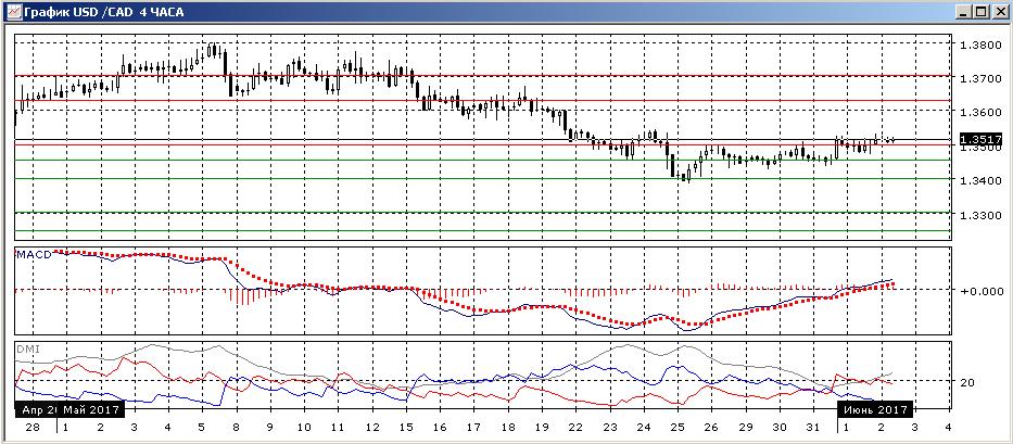 На четырёхчасовом графике пара перешла к росту: относительные минимумы пары растут, пара достигает новых максимумов. В этом масштабе пара уже преодолела уровень 1,3500, что может привести к дальнейшему росту (возможно, до следующего круглого уровня на 1,3600), если пара будет оставаться выше 1,3500. По индикаторам направленного движения пара растёт: DM+ увеличивает превышение над DM-, линия ADX растёт, линия MACD сохраняет положительный наклон.