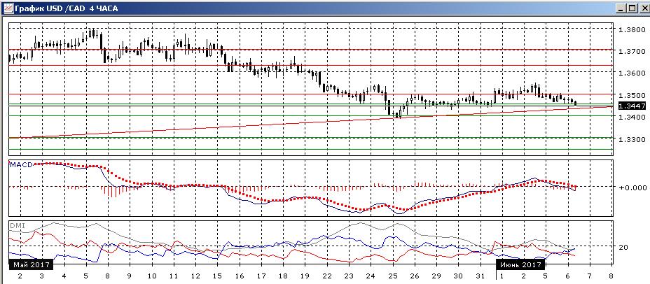 На дневном графике отскок от 1,3400, кажется завершается, и более вероятным видится возвращение к точке начала отскока на 1,3400 и возобновление снижения. Последовательность снижения от 1,3800 не нарушена. По индикаторам направленного движения тенденцией остаётся снижение: превышение DM- над DM+ сохраняется, гистограмма MACD остаётся в отрицательной зоне, линия MACD сохраняет отрицательный наклон. Существенным отличием от ситуации 2 июня является то, что пара приблизилась к линии восходящего тренда, если строить его с конца января. Преодоление этой линии может привести к более значительному снижению, возможно до поддержки марта-апреля на 1,3300.