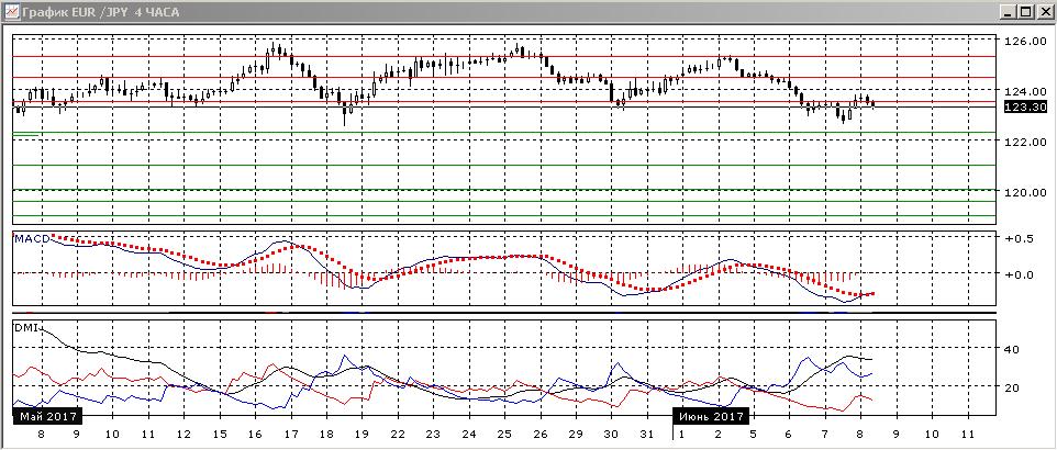 На дневном графике пара остаётся около нижней границы консолидации 123,50-125,30. Закрытие ниже 6 июня, скорее, обозначает дальнейшее снижение после выхода из диапазона. Несмотря на образование большой нижней тени у свечи 7 июня, разворота не было и пара остаётся предыдущего уровня поддержки 123,50, и если не будет подтверждения разворота, то целью видится уровень около 121,00, что примерно равно движению исходя из ширины диапазона, из которого вышла пара. Также был установлен более низкий относительный минимум, и теперь относительные минимумы и максимумы пары снижаются. По индикаторам направленного движения тенденцией становится снижение: гистограмма MACD продолжает снижаться в отрицательной области, линия MACD имеет отрицательный наклон, DM- уже выше DM+.