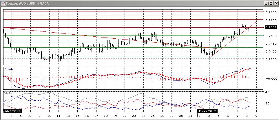 На четырёхчасовом графике продолжается энергичный рост, уровень 0,7500 выступил уже поддержкой для пары. Пара находится около краткосрочной линии тренда со 2 июня. То, что пара ниже, может привести к коррекции и периоду консолидации выше 0,7500. Последовательность роста относительных максимумов и минимумов пары не нарушена, По ADX тенденция снижения остаётся хорошо выраженной: превышение DM+над DM- значительное и устойчивое, ADX на высоком уровне. Скорее, рост будет продолжаться.