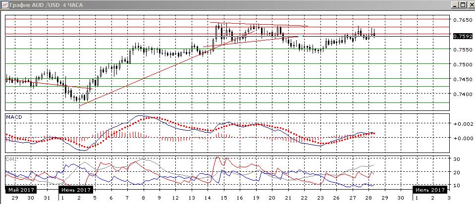 На четырёхчасовом графике видны откаты с приближением к 0,7635 — уровню сопротивления в середине июня. Последний максимум может быть ниже предыдущего, если он образуется сейчас. Так как пара вернулась ниже 0,7600, вероятно движение к предыдущему минимуму около 0,7550.